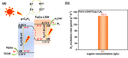 图2 (a) FeCo-LDH/g-C3N4纳米复合材料的光催化产氢机理图; (b) 光催化重整木质素制氢性能