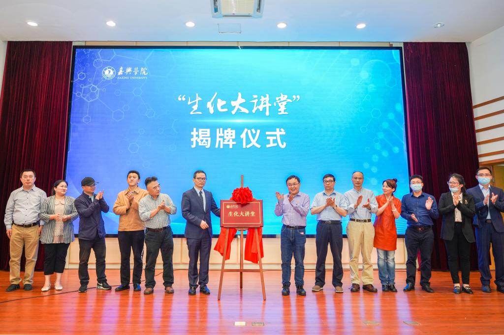仪式上,胡俊云、周宏伟共同为“生化大讲堂”揭牌,职能部门负责人、高层次人才代表、学院领导班子一起见证揭牌仪式。