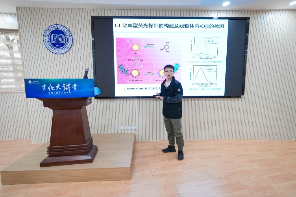 黄宏博士作题为《亚细胞结构内活性氧的原位检测及高效清除》的报告。他主要介绍多种细胞器靶向荧光探针的合成及其在细胞、组织、活体层次检测与清除活性氧方面的应用,并强调指出,活性氧具有浓度低、寿命短、活泼度高等特点,对亚细胞结构内活性氧的原位检测及清除,可为研究与亚细胞结构内活性氧相关疾病的发病机制及疾病预防、治疗提供方案。