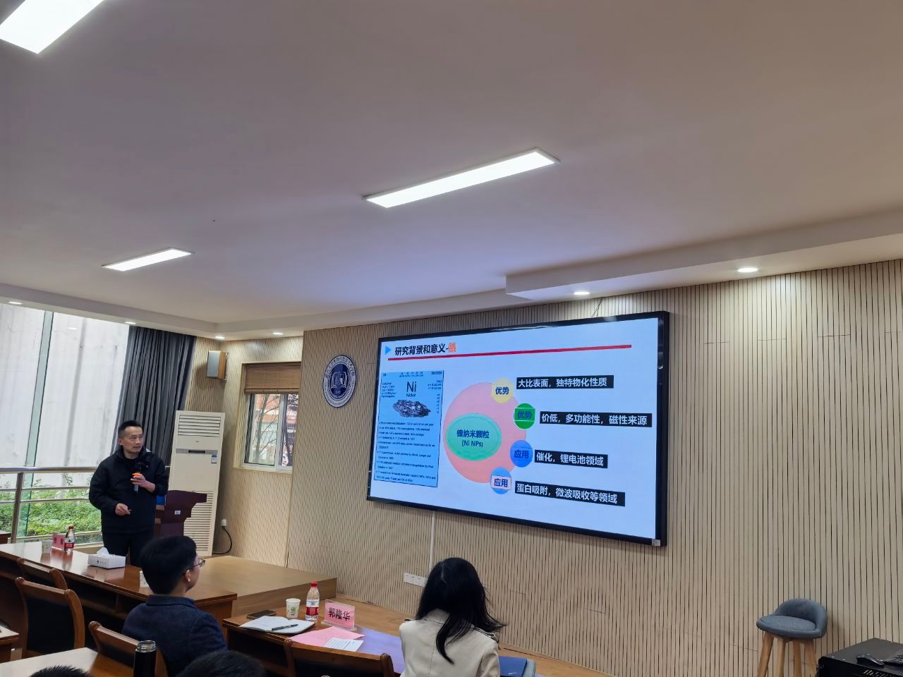 郭隆华教授主持会议,全院师生近50人到场聆听。