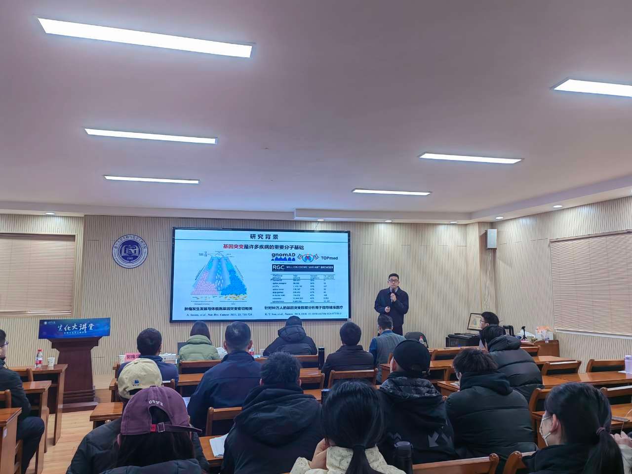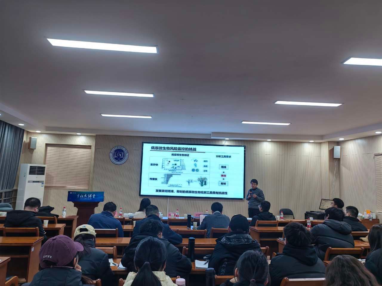 郭隆华教授主持会议,全院师生50余人到场聆听。