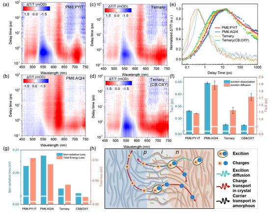 AQI4的引入通过构建级联能级(如HOMO/LUMO梯度)进一步优化了电荷转移驱动力,同时降低了非辐射复合。以上结果突出了AQI4和二元溶剂策略的不同作用。良溶剂CB和劣溶剂OXY的结合有效促进了PY-IT的结晶,形成了高密度电子受体纤维网络并压缩了混合相,从而构建了体相p-i-n结构。对于AQI4,CB和OXY均起到良溶剂的作用,保留了其成膜动力学过程,使其存在于i相中,优化了电荷转移动力学过程并抑制了能量损失,实现了VOC、JSC和FF的全面改善。