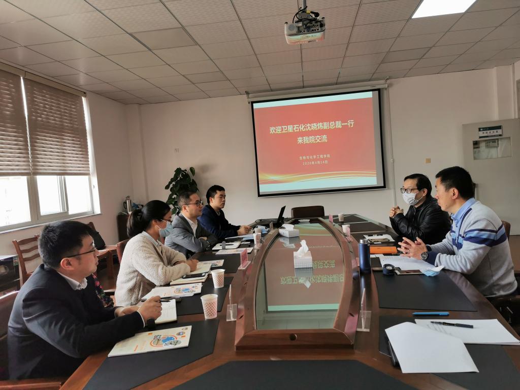 为进一步加深校企交流与合作,2020年4月14日上午,浙江卫星石化股份有限公司(以下简称卫星石化)副总裁沈晓炜、研发中心副主任刘睿、研发中心副主任程甜甜和人资中心副经理杨大伟一行来成人视频 交流,学院领导周宏伟院长、张瑾副院长参加座谈。
