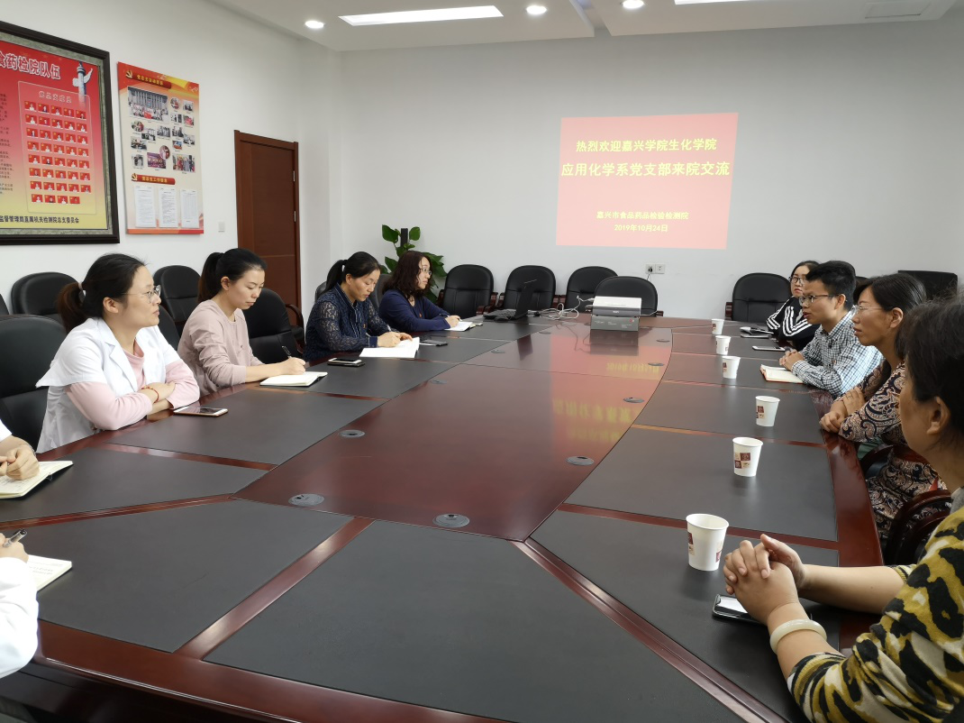 为深入学习党中央不忘初心、牢记使命主题教育精神,发扬党员“办实事、抓落实”的工作作风,1024日下午,应用化学系党支部走访应用化学专业实习基地——嘉兴市食品药品检验检测院,调研应用化学专业本科生实习情况,征求合作单位对我校实习工作的意见和建议。