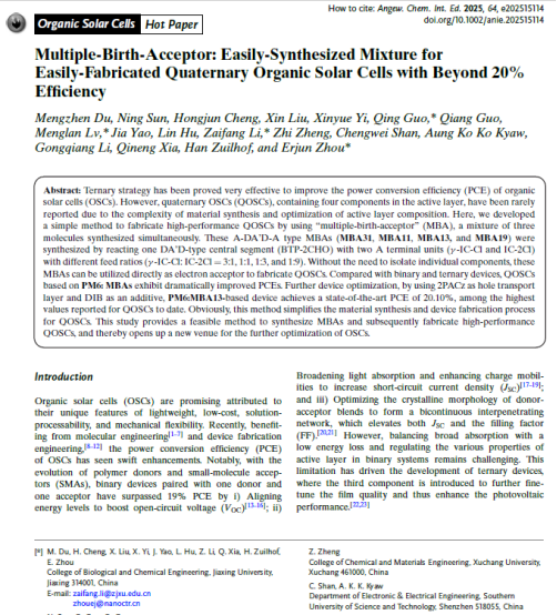周二军团队在有机太阳能电池方向取得重要研究进展。相关研究成果以“Multiple-Birth-Acceptor : Easily-Synthesized Mixture for Easily-Fabricated Quaternary Organic Solar Cells with Beyond 20% Efficiency”为题,在化学类顶级期刊《Angew. Chem. Int. Ed.》上发表。这是我校首次以第一单位在该顶级期刊发表论文,第一作者为成人视频