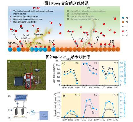 银(Ag)是室温下导电性最高的金属,适合作为电催化剂的辅助金属。然而,银在电氧化反应中并无催化活性,且较易氧化(0.7996 V vs. RHE),因此多数研究人员忽略了其在电催化氧化反应中的作用。在成人视频 曹雪波研究团队的指导下,马佳敏等本科生携手杨颖等研究生开展研究,他们发现,Ag原子作为辅助金属,不仅通过传统配体效应优化催化中心Pt/Pd的电子结构,进而促进乙二醇的催化氧化,还借助原位电化学光谱学技术与理论计算揭示了Ag原子的另一重要作用:加速催化剂活化水分子,并产生羟基自由基(*OH),形成Ag-OH活性物种。Ag-OH活性物种能以一种更优的、非竞争性的Langmuir–Hinshelwood机制加速醇脱质子(1),并快速释放氧化的碳基中间体,从而高选择性、高通量地得到目标产物乙醇酸与氢气,并能有效防止催化剂毒化,相关成果发表于中科院一区期刊上(Journal of Colloid and Interface Science 2025684197–206)。该研究小组还发现,在Ag-PdPtskin纳米线催化的乙二醇电氧化耦合制氢体系中,在>1.2 V电位下,会形成Ag2+Ag活性物种能以非法拉第的模式直接氧化乙二醇与某些有毒中间体,从而提高催化剂的活性与抗中毒能力。在以粗乙二醇为原料的无膜电解制氢体系中,表现出超过3000小时的稳定性与工业级电流密度(>400 mA/cm2)(2),相关成果发表于中科院一区期刊上(Advanced Functional Materials. 2024, 2418588)。以上研究受到国创项目(《银纳米线选择性电氧化醇耦合制氢》,马佳敏等人,指导老师黄林/曹雪波)、国家自然科学基金(no.2227507422102063)与企业横向等课题的资助。